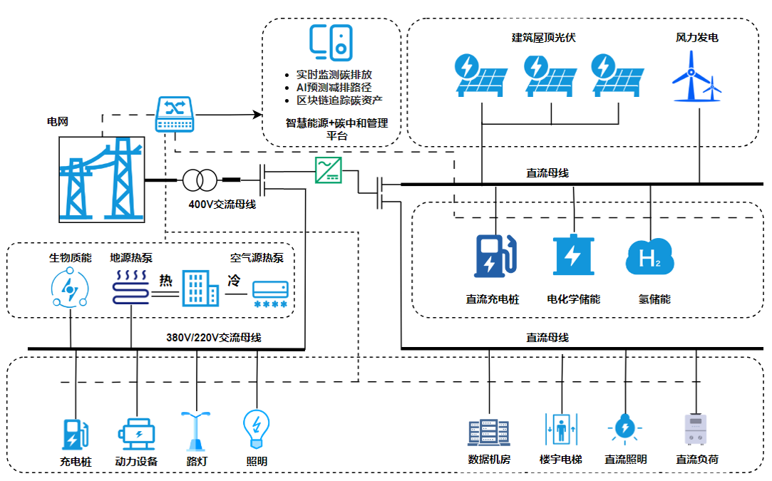 围绕园区能源生产侧、消费侧、分配测、调节测等环节,通过能源测绿色供给,消费侧减碳降碳,能源供需高效匹配,实现园区精细化管理,推动园区的碳中和目标