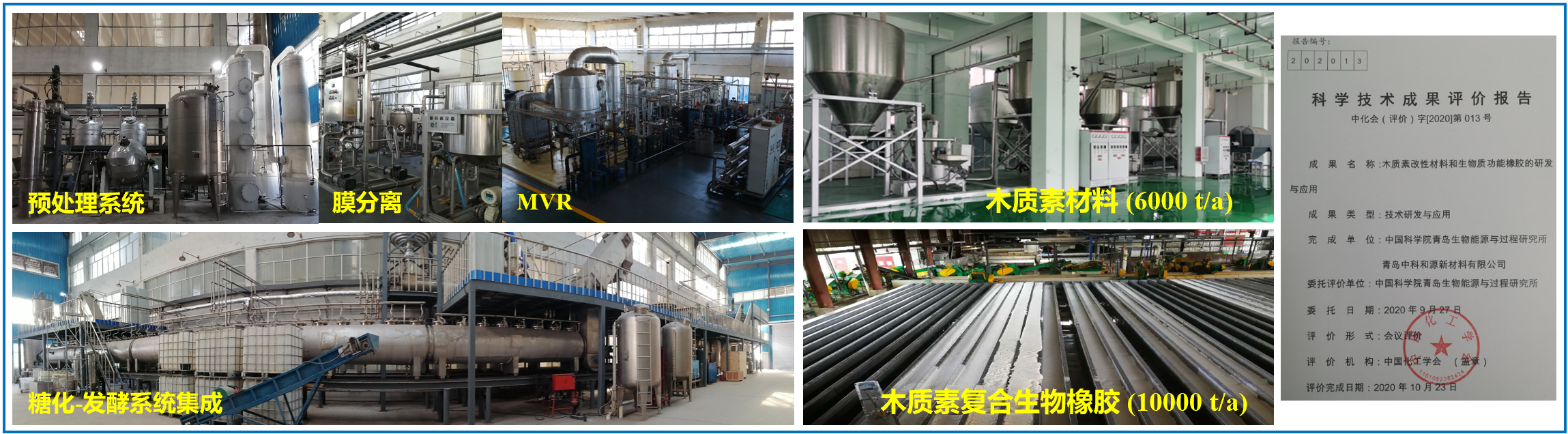 针对我国农林剩余物规模化转化与利用的重大需求,以及合成生物学规模化应用对非粮可发酵糖原料的需求,木质纤维绿碳材料项目部依据玉米秸秆、蔗渣、芒草等原料特性,基于整合生物质精炼的策略,建立了清洁改良磺化预处理-低成本高固酶解糖化,以及副产物综合利用关键集成技术,木质素脱除率>85%,糖液浓度>150 g/L,糖液适合发酵产乙醇、丁醇和DHA等。预处理分离的可溶性磺化木质素可用作染料分散剂、水泥减水剂和植物生长促进剂等;糖化残余酶解木质素可用于产板材生物粘合剂(依据中国国家标准(GB/T 17657-2013)人造板及饰面人造板理化性能试验方法,胶黏剂压制的胶合板超过II类胶合板的标准(>0.7 MPa))、生物炭黑或橡胶相容剂。前期已与山东寿光巨能金玉米开发有限公司开展合作,建成了年处理千吨级原料的秸秆整合生物质精炼中试示范;木质素改性材料和生物质功能橡胶核心技术通过了中国化工学会技术鉴定(国际先进),实现了木质素复合天然橡胶的规模化应用示范(产能1万吨/年)。
